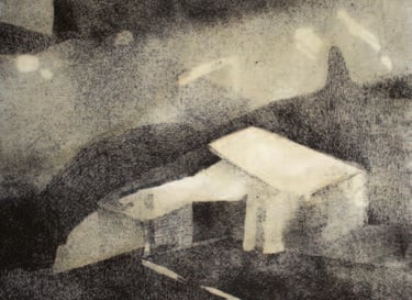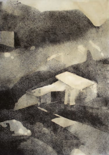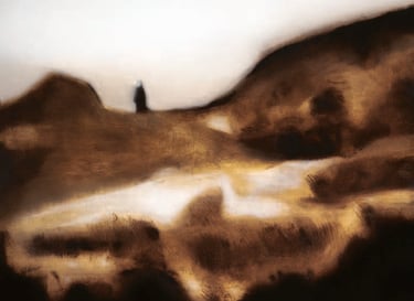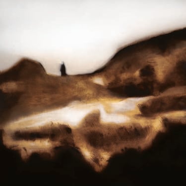 Il dipinto mostra una scena onirica e sfumata nelle tonalità del seppia. La composizione, realizzata con pennellate morbide, descrive un paesaggio avvolto in una fitta nebbia che nasconde i dettagli e aggiunge mistero alla scena. Forme indistinte emergono suggerendo presenze enigmatiche che oscillano tra visibile e invisibile. Nonostante l'oscurità, pervade un senso di speranza grazie ad una figura intenta a dirigersi verso una luce promettente. L'uso del monocromo e della poca definizione evoca una nostalgia riflessiva e un senso di spaesamento, spingendo l'osservatore a trovare significati nelle forme evanescenti, sottolineando un viaggio interiore verso la speranza in un contesto di incertezza e mistero.