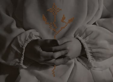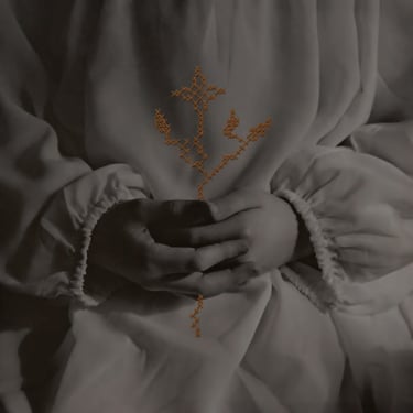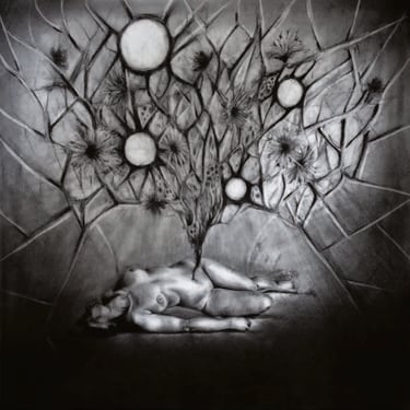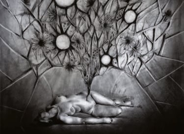 Una donna è stesa per terra in un ambiente spoglio, in uno stato di vulnerabilità e abbondono. Dal suo ombelico, luogo di origine, partono dei rami che si espandono in un groviglio do cui sbocciano fiori, in una dimensione di rigenerazione spirituale, simboleggiando la rinascita nel buio e la fioritura della vita