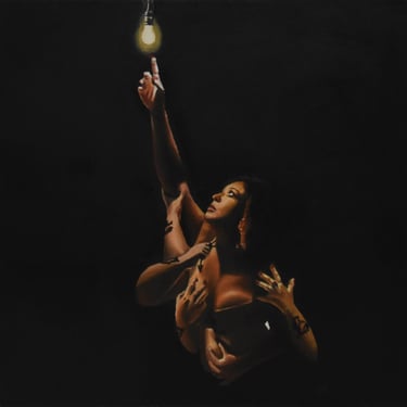 Ho deciso di esporre per il concorso "Seminare la Speranza" un ritratto raffigurante me stessa (soggetto principale) che tenta di toccare la lampadina posta in alto da cui proviene l'unica fonte di luce, rappresentando così la "Speranza" e contrastata dalle mani e braccia, prese sempre da fotografie di me stessa, che stringono e premono sul corpo della figura principale per impedirle di raggiungere la luce. Ho deciso di mettere un argomento molto personale ed esporre molto il mio corpo cosicché si mischiasse al tema dell'esposizione, ovvero la Speranza. Nei miei precedenti dipinti ho sempre utilizzato il metodo di fotografare me stessa e dipingermi, creando opere iperrealistiche e surreali, owero il mio principale stile.